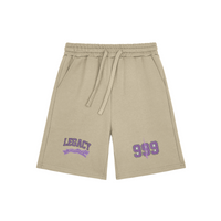 Stay comfortable and stylish with these beige cotton sweatshorts featuring bold "LEGACY" and "999" purple graphic prints. Designed with an adjustable drawstring waistband and side pockets, these men’s streetwear shorts blend everyday comfort with urban edge. Perfect for casual wear, lounging, or completing your hypebeast outfit.