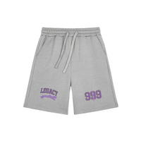 Stay comfortable and stylish with these light grey cotton fleece shorts featuring bold "LEGACY" and "999" purple graphic prints. Designed with an adjustable drawstring waistband and side pockets, these men’s streetwear shorts blend everyday comfort with urban edge. Perfect for casual wear, lounging, or completing your hypebeast outfit.