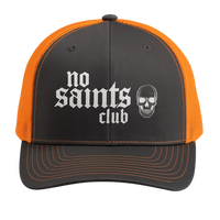 This cap features a charcoal gray front panel and bill, sharply contrasted by a vibrant blaze orange mesh back and stitching. The bold white “No Saints Club” logo with skull emblem stands out with intense contrast, giving it a rugged, high-visibility street-meets-outdoors vibe.