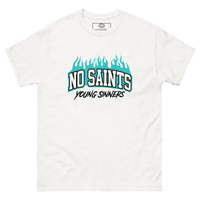 Make a bold statement with the No Saints Young Sinners graphic tee. Featuring a striking teal flame design and edgy streetwear typography, this premium cotton t-shirt blends urban attitude with modern style. Perfect for fans of alternative fashion, hype culture, and graphic streetwear.